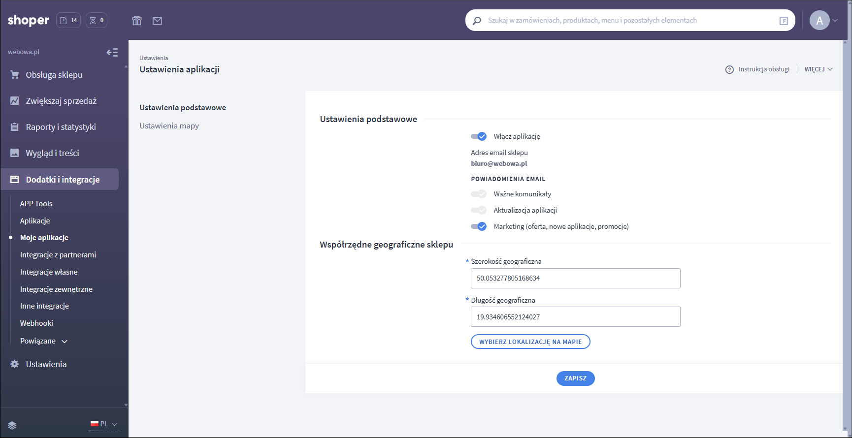 Dodanie mapy zajmuje zaledwie chwilę. Wystarczy wskazać adres sklepu, wybrać styl mapy i zapisać zmiany. Aplikacja działa zarówno w klasycznym szablonie RWD, jak i w nowoczesnej technologii Storefront.