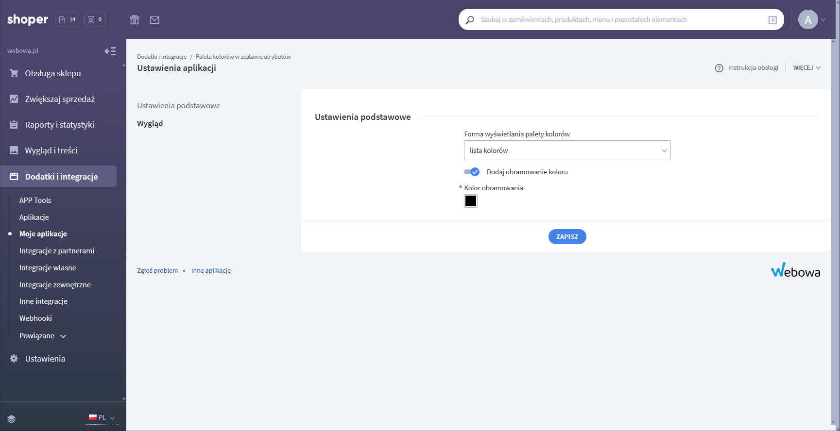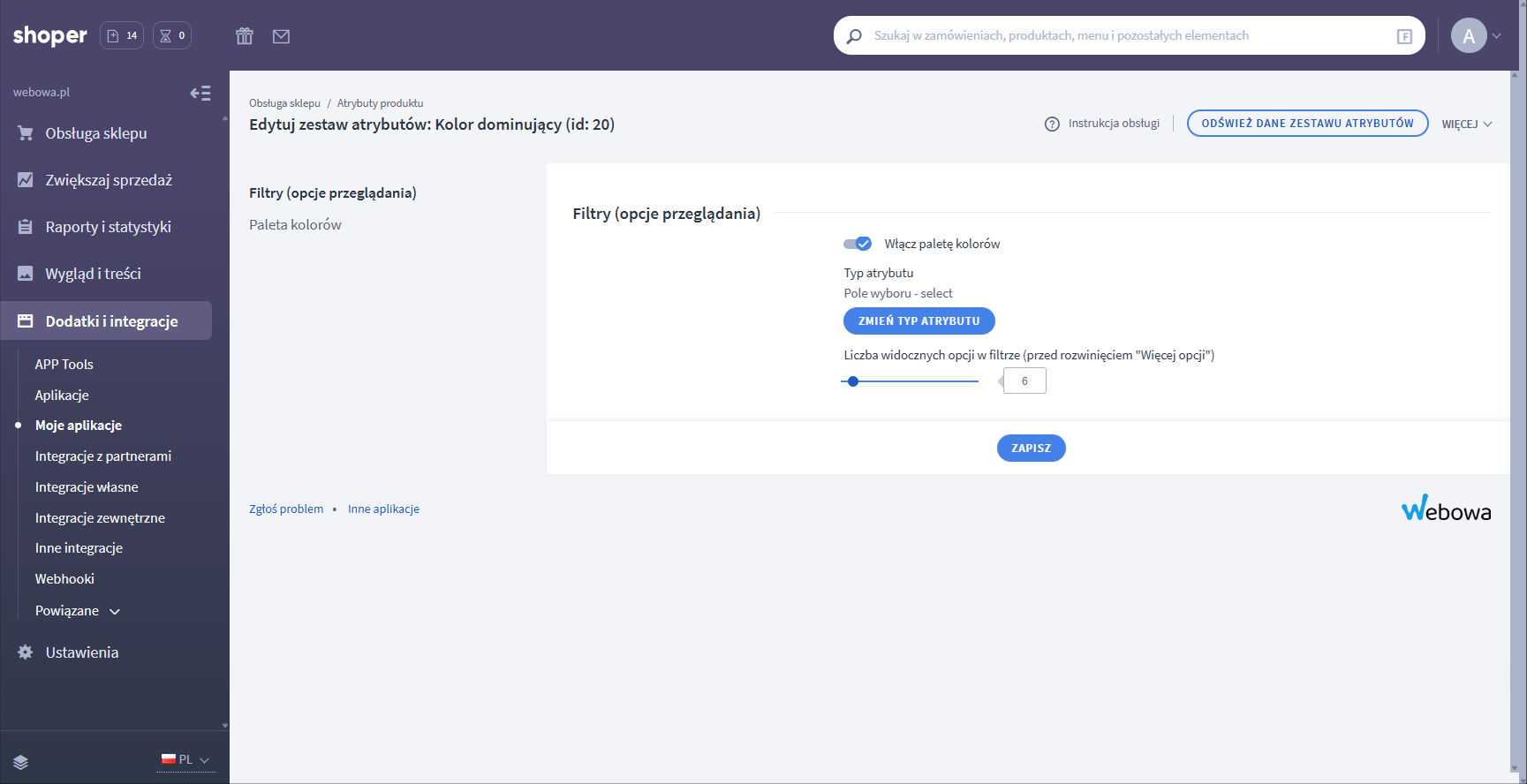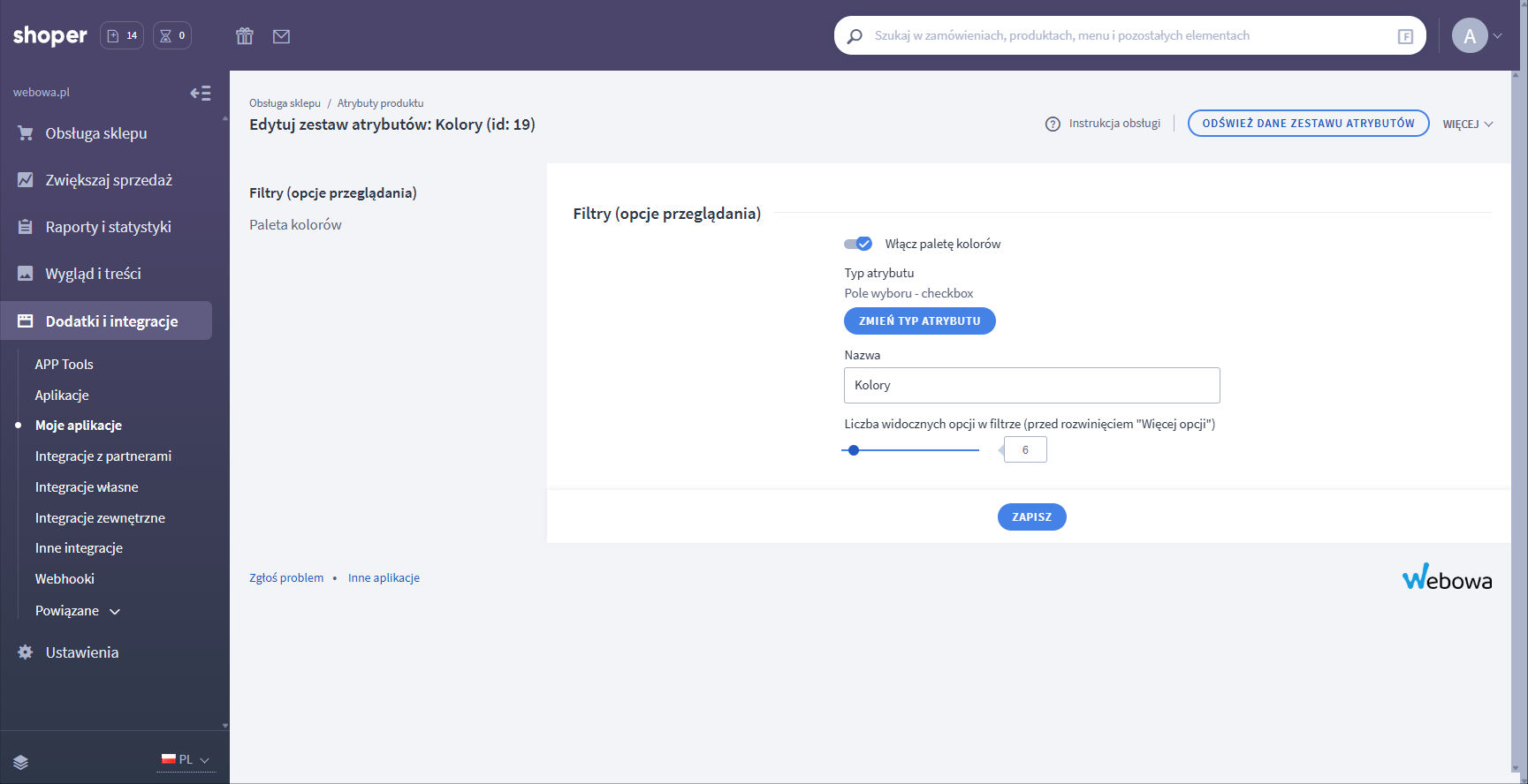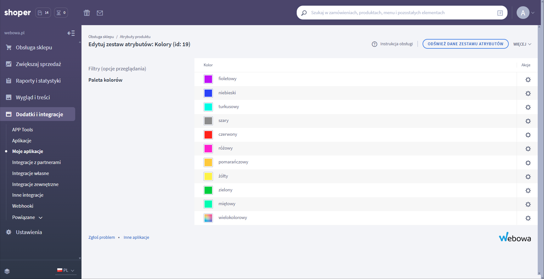 Aplikacja Paleta kolorów w zestawie atrybutów pozwala przypisać do wybranych atrybutów konkretne kolory. Dzięki temu klienci mogą szybko filtrować produkty po kolorach, bez konieczności przeglądania całej oferty.