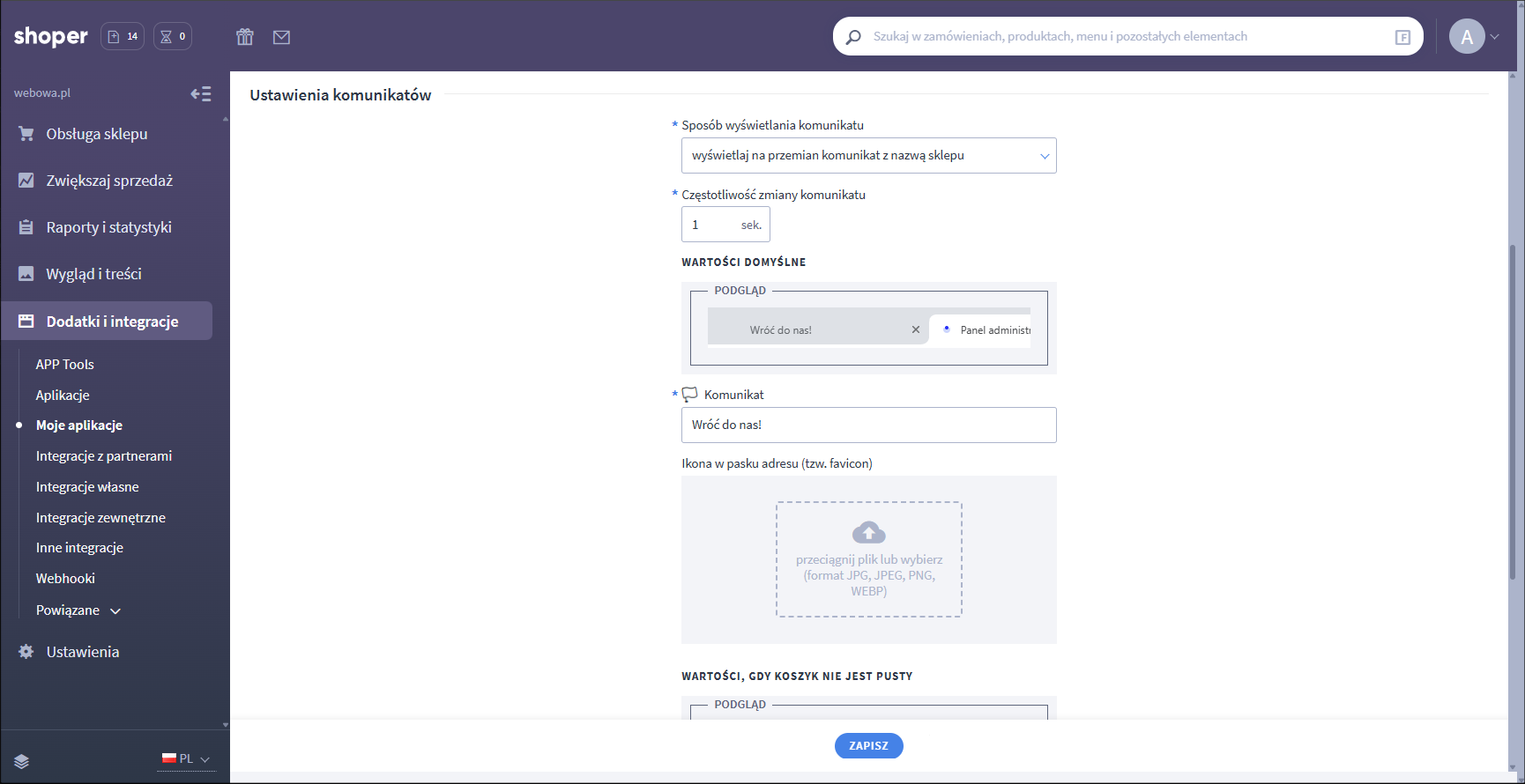 Klienci często pracują na wielu kartach jednocześnie i mogą zapomnieć o niedokończonych zakupach. Aplikacja „Wróć do nas!” na karcie przeglądarki pozwala wyświetlać krótkie, przyjazne komunikaty w tytule karty (oraz zmieniać favicon), gdy klient przejdzie do innej zakładki. To prosty sposób, by przypomnieć o koszyku, promocji lub powrocie do sklepu.