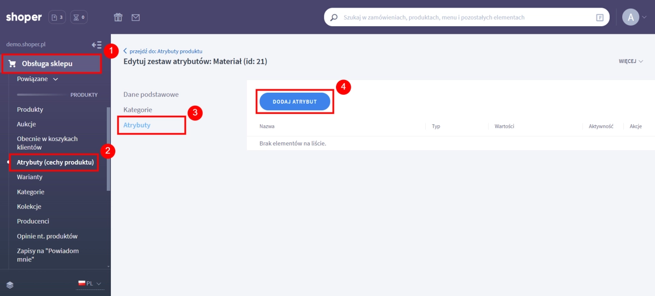 - Z menu po lewej stronie wybierz zakładkę Atrybuty i kliknij przycisk Dodaj atrybut.