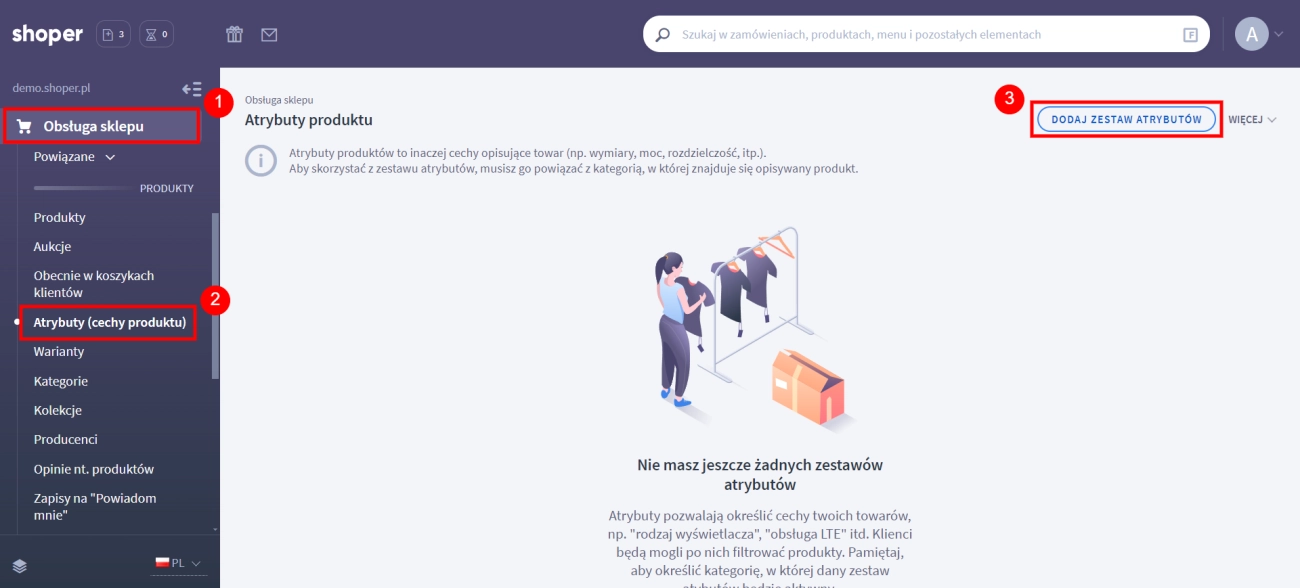- W zakładce Obsługa sklepu → Atrybuty (cechy produktu) kliknij przycisk Dodaj zestaw atrybutów.