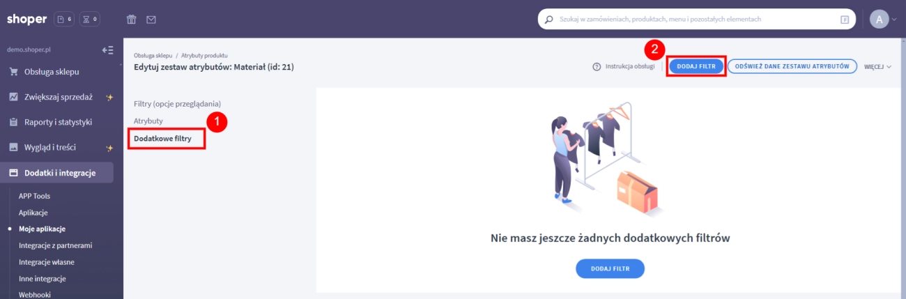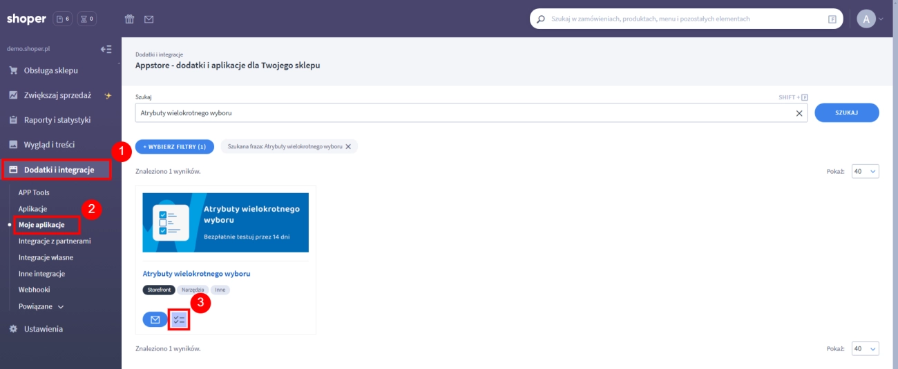 - W zakładce Dodatki i integracje → Moje aplikacje wyszukaj Atrybuty wielokrotnego wyboru i kliknij ikonę aplikacji.