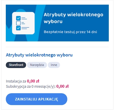 - W zakładce Dodatki i integracje → Aplikacje wyszukaj aplikację Atrybuty wielokrotnego wyboru i kliknij przycisk Zainstaluj aplikację.