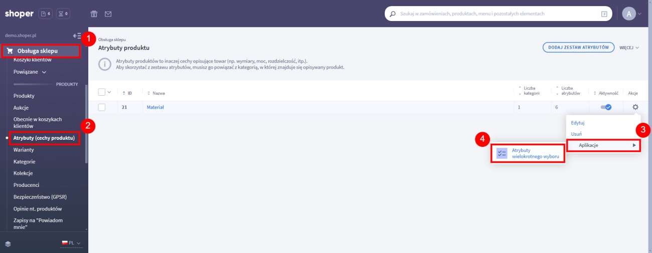 - W zakładce Obsługa sklepu → Atrybuty (cechy produktu) dla zestawu atrybutów z paletą kolorów w kolumnie Akcje, po prawej stronie, kliknij trybik i wybierz opcję Aplikacje → Atrybuty wielokrotnego wyboru.
