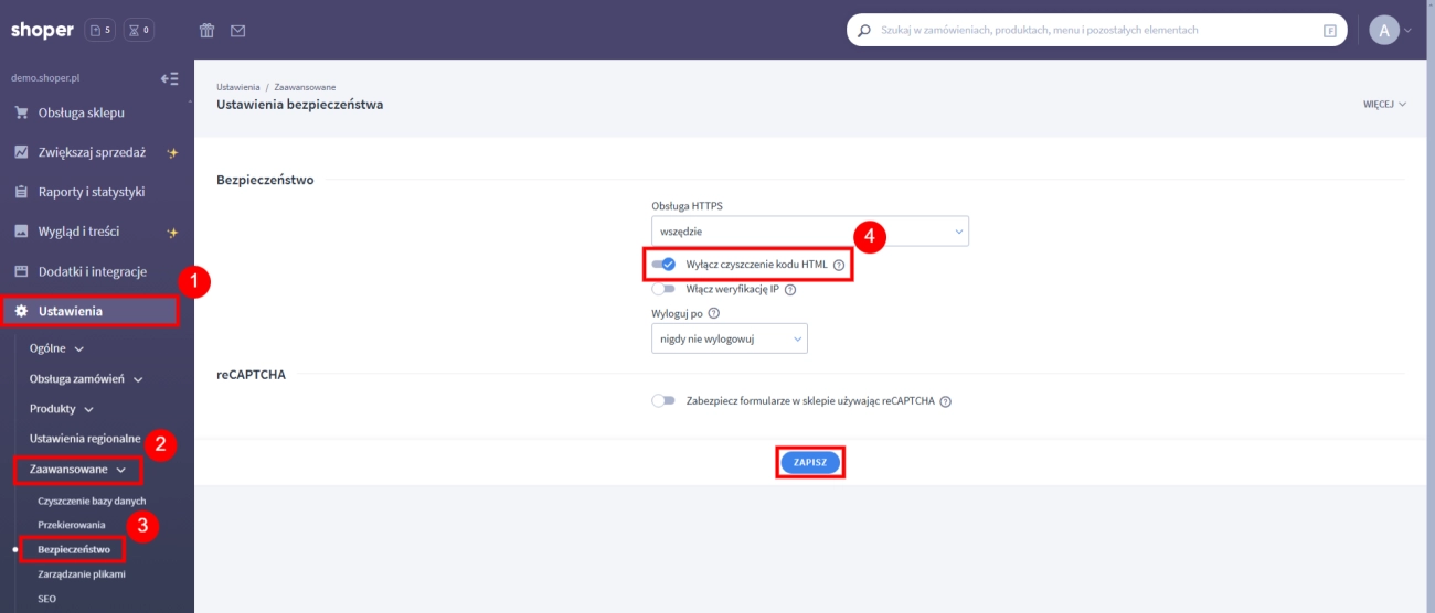 - Zaznacz opcję Wyłącz czyszczenie kodu HTML.