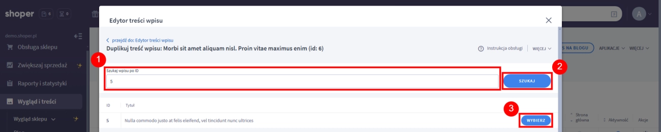- Wyszukaj wpis bloga po ID, do którego treść chcesz zduplikować.