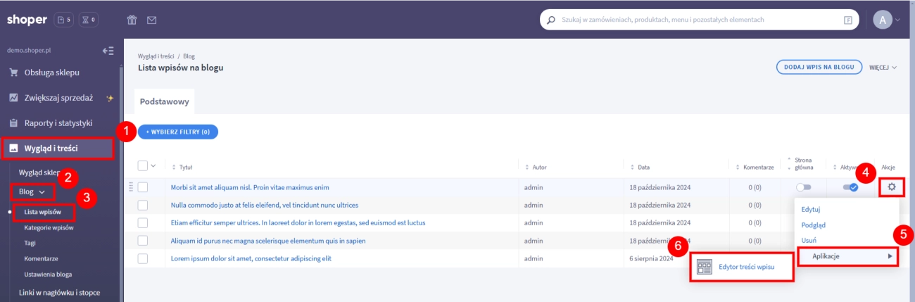 - Przejdź do Wygląd i treści → Blog → Lista wpisów.
