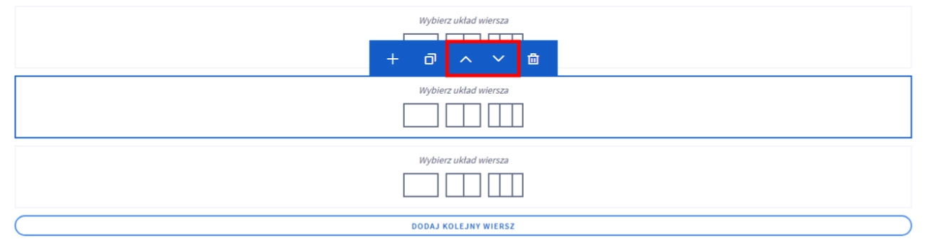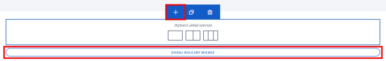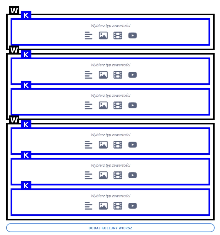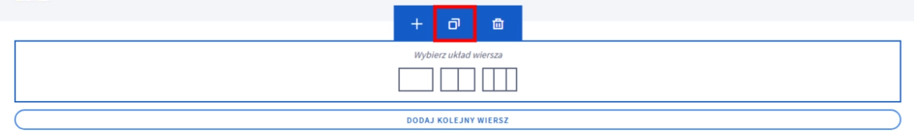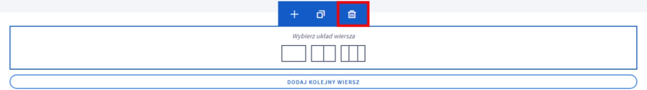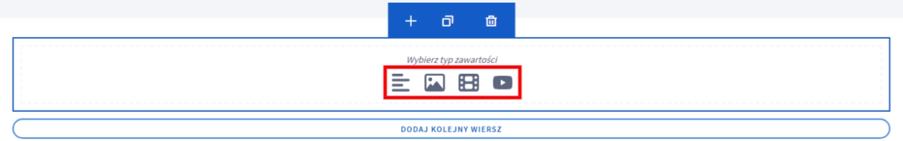 Edytor treści umożliwia dodawanie nowych wierszy i kolumn do układu treści, edycje dodanych treści, duplikowanie, usunięcie czy zmianę kolejności wierszy.