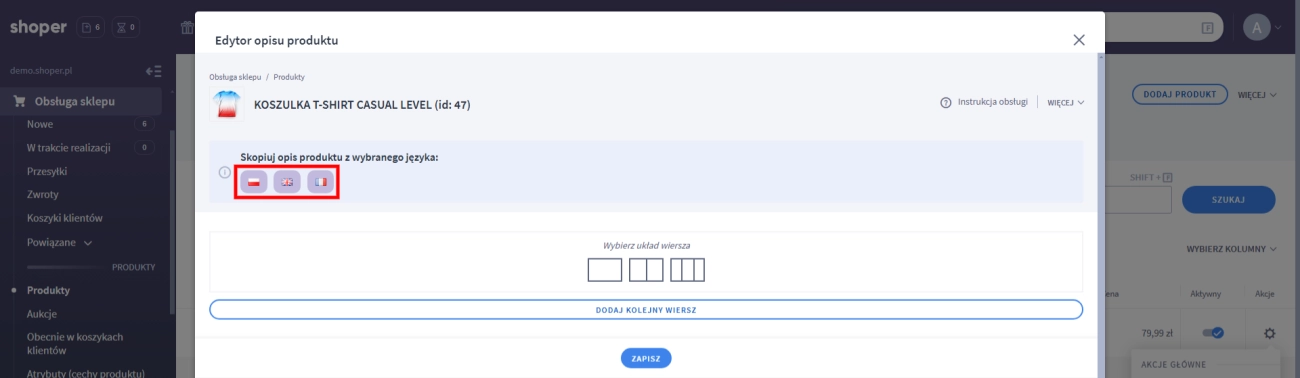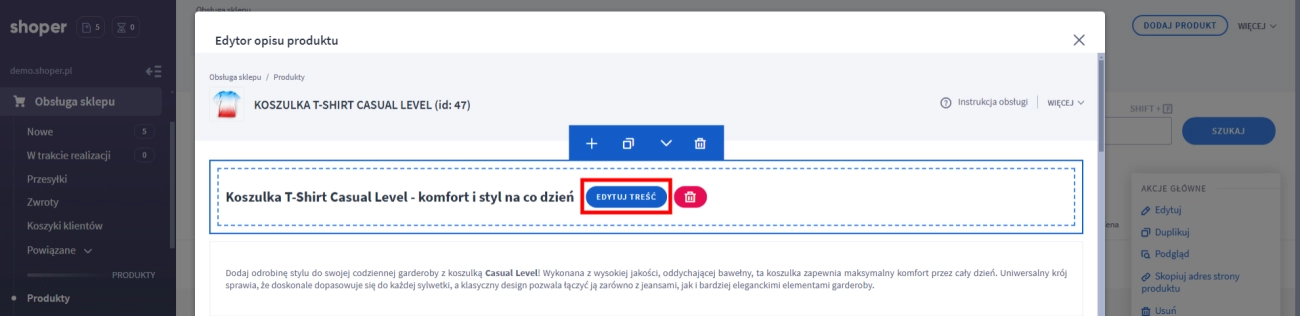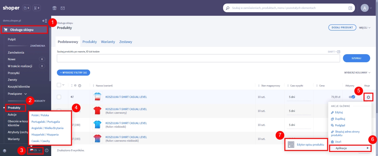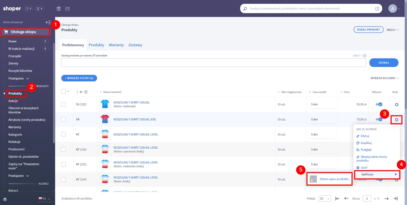 - W kolumnie Akcje, po prawej stronie, kliknij trybik i wybierz opcję Aplikacje → Edytor opisu produktu.