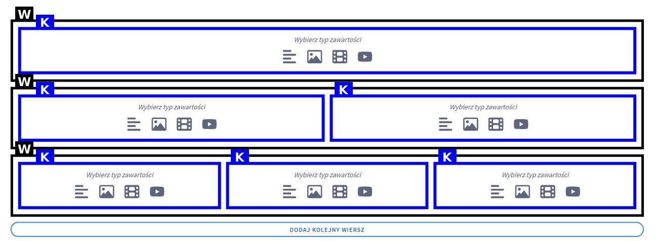 Z poziomu edytora treści utworzysz siatkę (tzw. grid), dzięki której zaprojektujesz układ treści, decydując o ilości wierszy i kolumn, w których mają się wyświetlać.