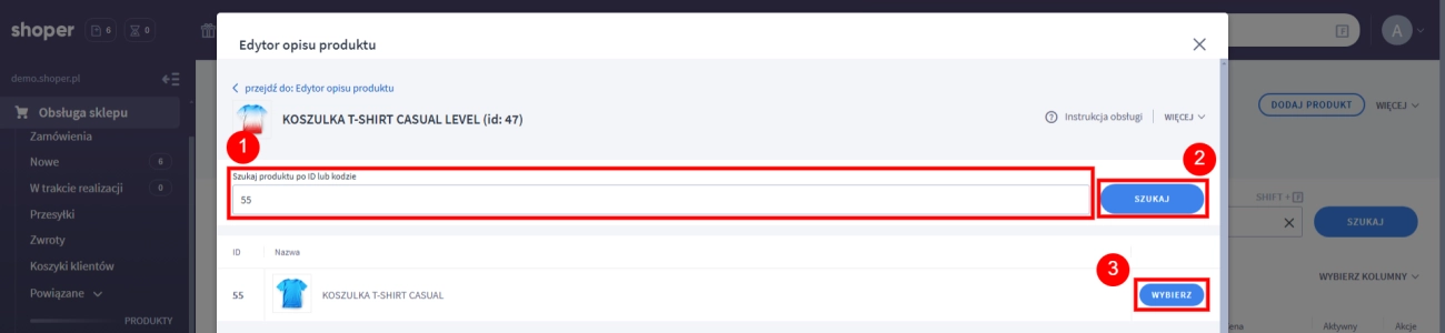- Wyszukaj produkt po ID lub kodzie, do którego opis chcesz zduplikować.