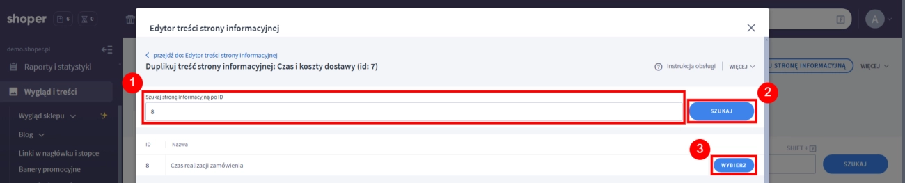 - Wyszukaj stronę informacyjną po ID, do której treść chcesz zduplikować.
