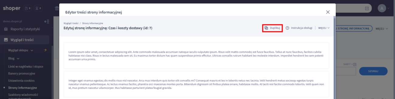 - Odszukaj stronę informacyjną, której treść chcesz zduplikować.