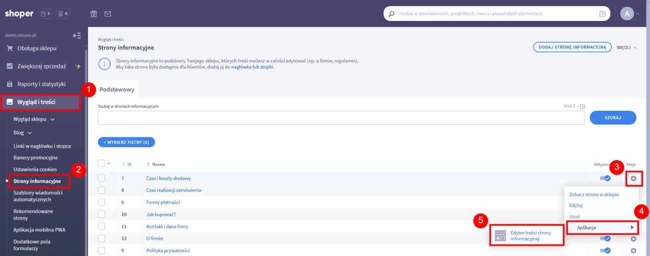 - Przejdź do Wygląd i treści → Strony informacyjne.