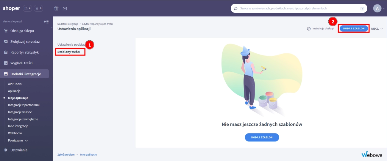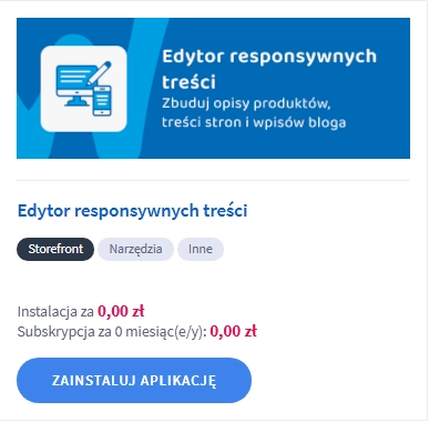 - W zakładce Dodatki i integracje → Aplikacje wyszukaj aplikację Edytor responsywnych treści i kliknij przycisk Zainstaluj aplikację.
