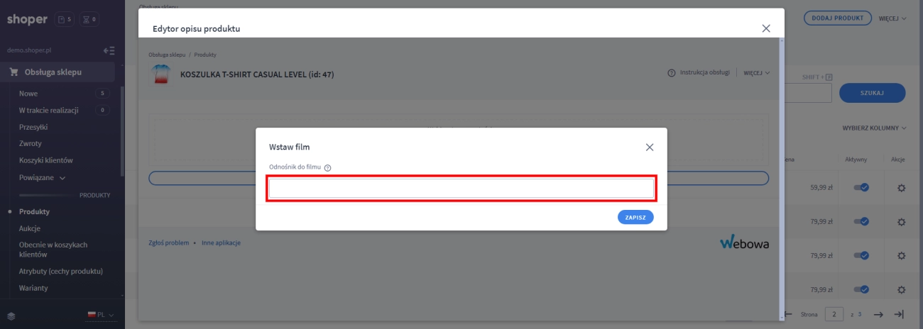 Przejdź do działu Wgrywanie obrazka/filmu do sklepu, aby dowiedzieć się jak wgrać film do sklepu.
