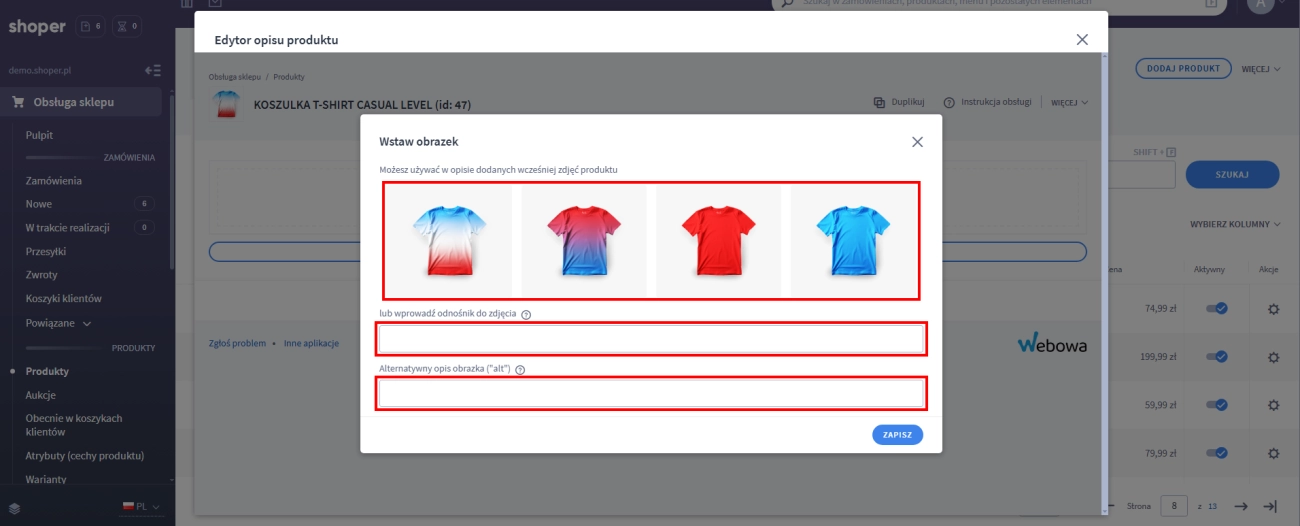 Przejdź do działu Wgrywanie obrazka/filmu do sklepu, aby dowiedzieć się jak wgrać obrazek do sklepu.