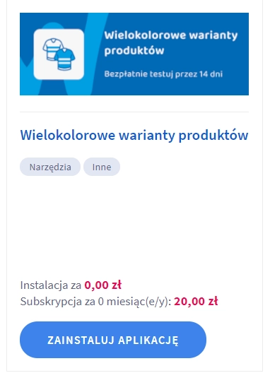 - W zakładce Dodatki i integracje → Aplikacje wyszukaj aplikację Wielokolorowe warianty produktów i kliknij przycisk Zainstaluj aplikację.