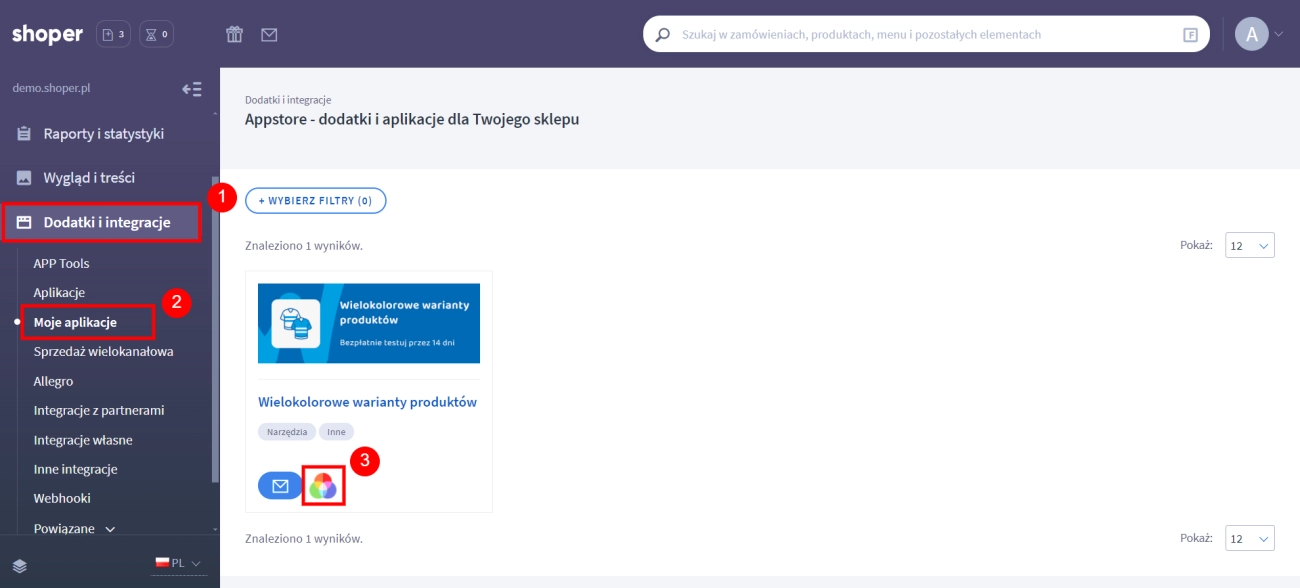 - W zakładce Dodatki i integracje → Moje aplikacje wyszukaj Wielokolorowe warianty produktów i kliknij ikonę aplikacji.