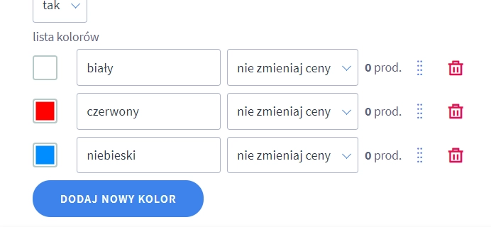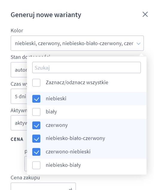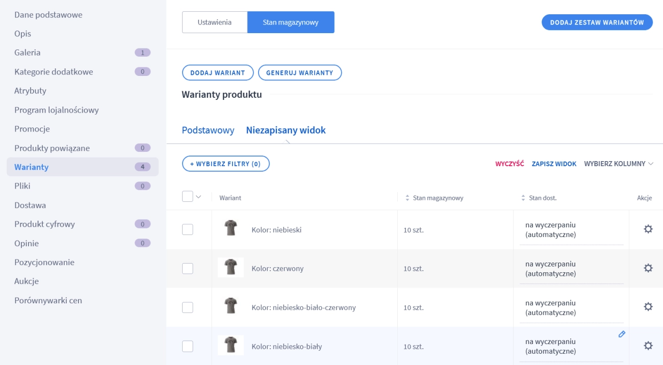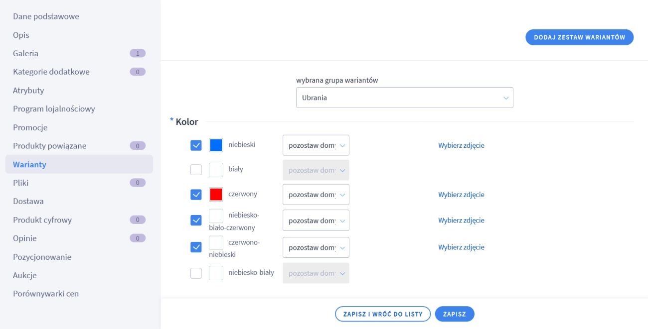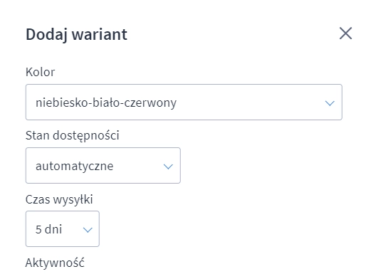 - Przycisk Dodaj wariant pozwala na ręczne tworzenie każdej kombinacji, np. kolor niebiesko-biało-czerwony i rozmiar M (lub po prostu kolor czerwony, jeżeli utworzona została jedna cecha).