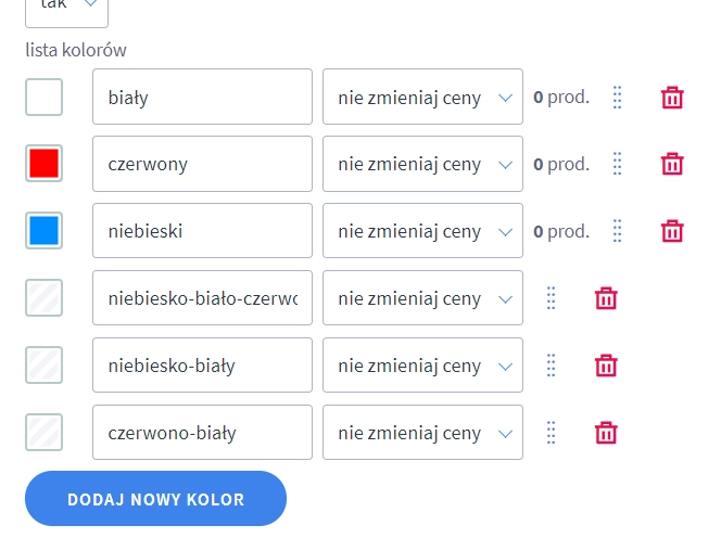 Dodaj kolory podstawowe (np. niebieski, biały, czerwony), które wykorzystasz do zbudowania wersji wielokolorowej oraz dla produktów w jednym kolorze.