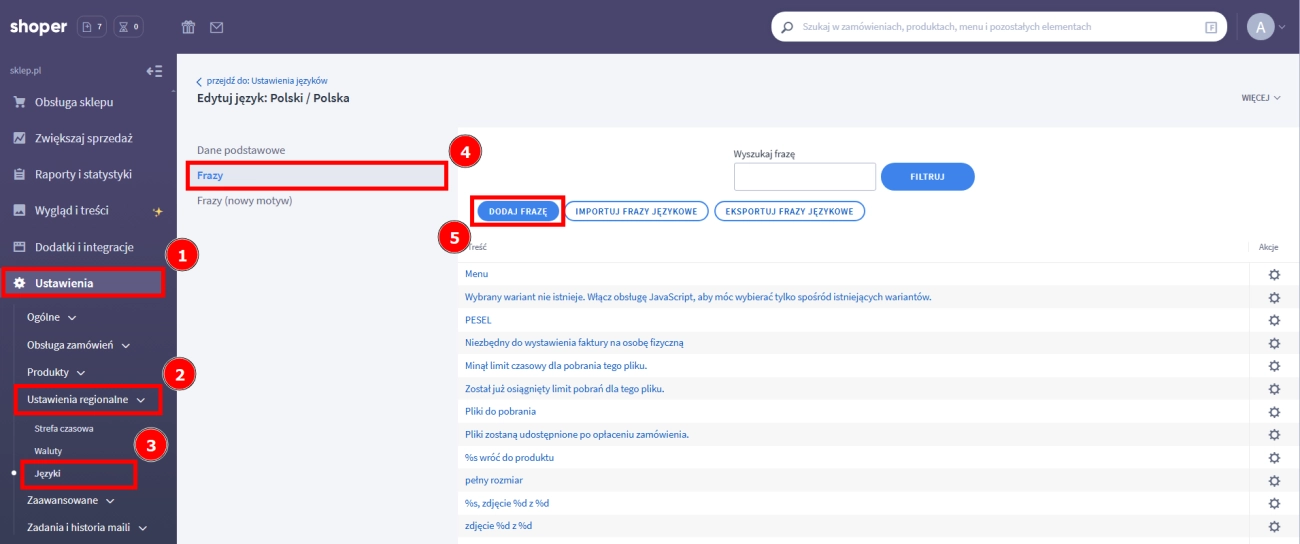 - Zmień zakładkę na Frazy (4) i kliknij przycisk DODAJ FRAZĘ (5).