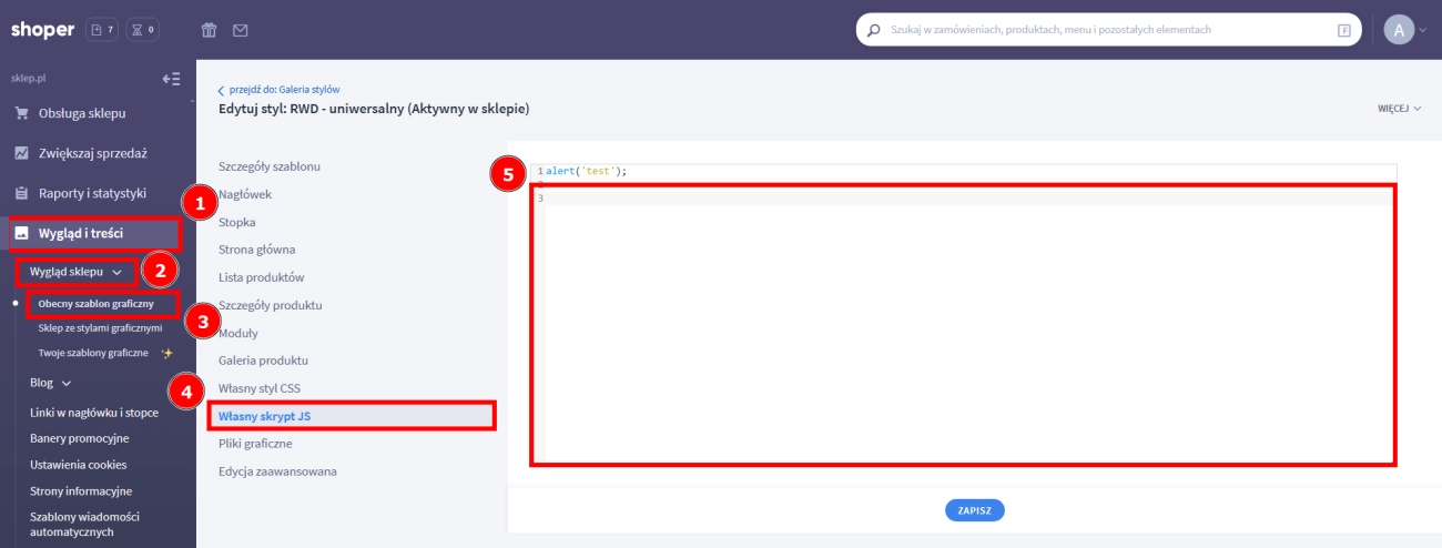 - Zmień zakładkę na Własny skrypt JS (4) i w edytorze dodaj zawartość pliku (5).