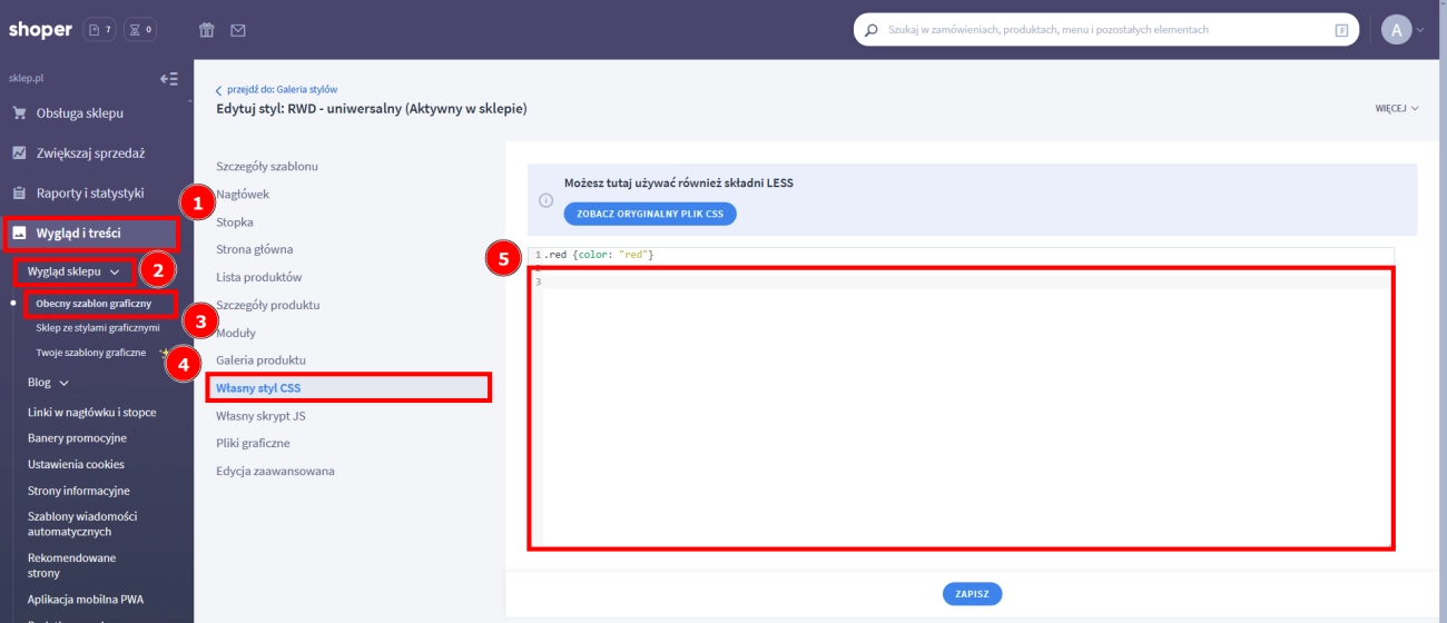 - Zmień zakładkę na Własny styl CSS (4) i w edytorze dodaj zawartość pliku (5).